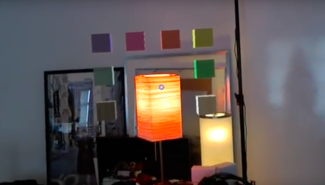 A screenshot of the Hololens lighting control app in action. The blue dot follows the user's line of sight.